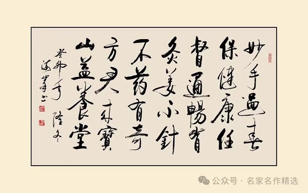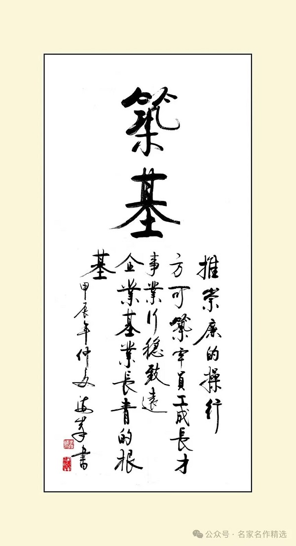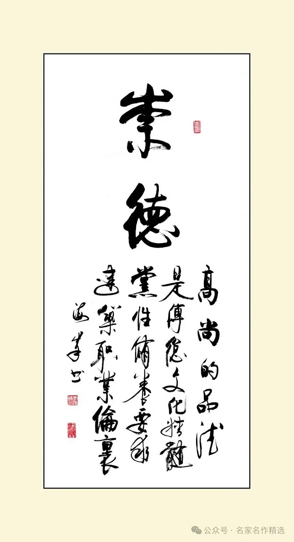 作品风格,《行万里路读万卷书》、《不忘初心》、《携手构建合作共赢新伙伴同心打造人类命运同体》及几首唐诗作品,创作立意高,其用笔中锋铺毫,逆入平出,藏峰一致,非真非草。细看稼纤间出,离方遁圆,筋力老健,风骨洒脱,墨纵有余,肥瘠相称,章法布局笔触、间白风格和谐,用书法讲述中国故事。