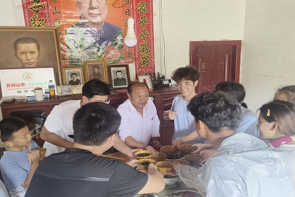 餐后,大家与当地农户深入交流,才得知这位爷爷是烈士后代,曾多次受邀为各类组织、学校讲述红色故事。他拿出珍藏的聘书、奖状向大家展示,回忆参加红色宣讲活动的往事,还勉励大家早日入党、勤奋学习,听从党和国家的安排,为人民与国家奉献力量。爷爷与他父亲的事迹深深打动了在场所有人,大家争相与爷爷合影留念。