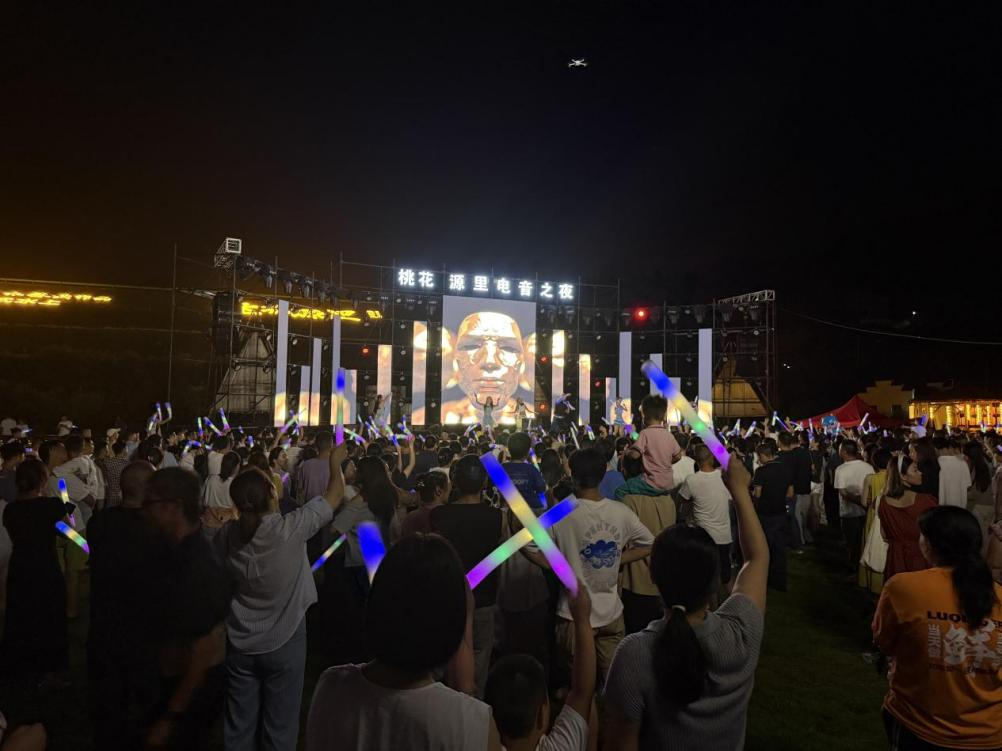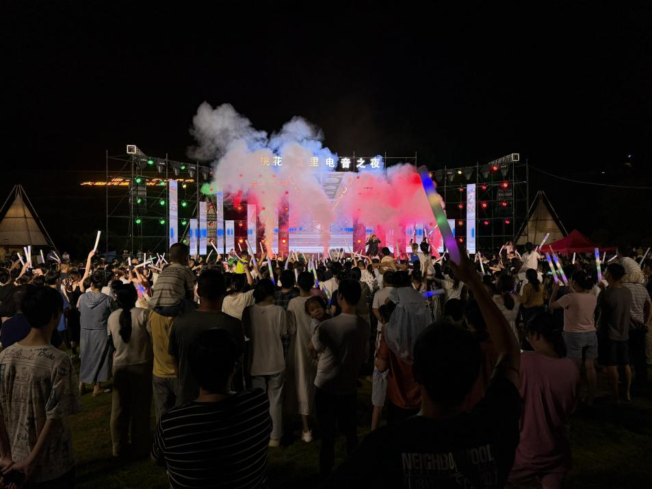 7月11日晚,湖北省大冶市沼山古村桃乡景区灯火璀璨、人声鼎沸。随着夜幕降临,“沼山古村桃乡·桃花源里仲夏电音狂欢夜”在桃里露营地正式拉开帷幕,一场融合现代音乐、非遗展示与美食体验的夏日盛宴在这里热烈上演。