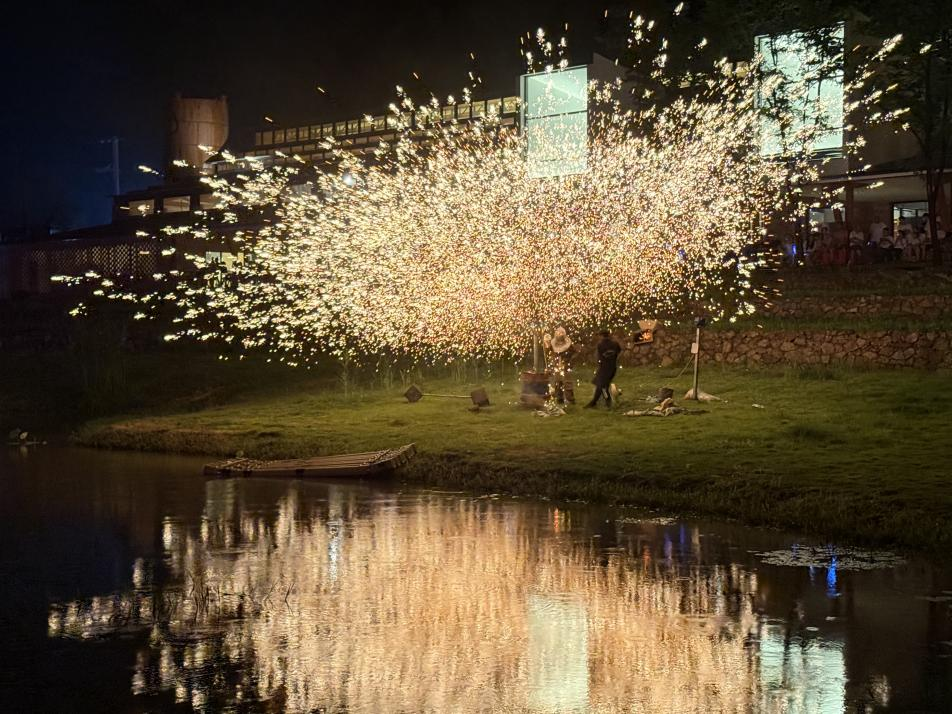 此次电音节不仅是一场音乐的狂欢,还是一个展示传统文化魅力与非物质文化遗产的重要平台。在一片开阔的草坪上,“铁花”手们手持长勺,将炽热的铁水高高抛起,紧接着用木板猛力击打,刹那间,铁水化作无数璀璨的火花,在夜空中绽放开来,如同一朵朵绚烂的花朵。这些火花如流星般划过夜空,洒落在四周,让观众仿佛置身于“东风夜放花千树,更吹落星如雨”的诗意画卷之中。