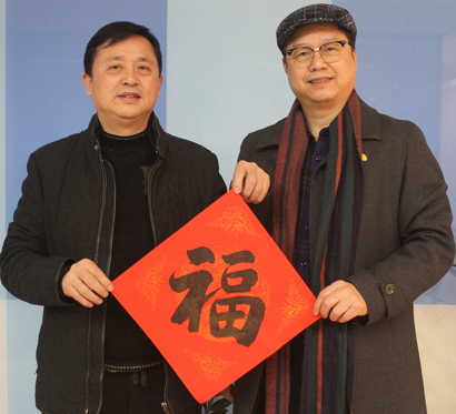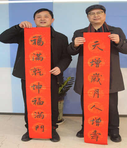 书法家胡家勇(右一)赠送农民工春联、山河集团党委副书记徐友明(左一)代表接受