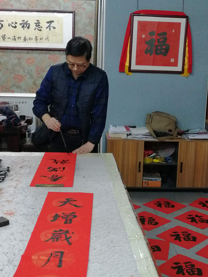 走进胡家勇先生在武汉“海山金谷”艺术工作室,红色春联堆满小屋,胡先生拿着一份名单介绍说:这些春联是赠送给一些孤寡老人以及在武汉工作的部分农民工兄弟带回家的新年礼物,对联寓意好,红色又喜庆。我作为武汉市的市民,也是这座城市的主人,理应为这座城市的建设者尽一份绵薄之力,有一首歌是这样唱的“人人都献出一点爱,世界将变成美好的人间”。在与胡家勇先生的交谈中,笔者深深的体会到他作为一名中共党员,又是党的高级干部(湖北省委老干局副局长,正厅级),始终牢记自己的职责,严格要求,刻苦学习,把党的利益、国家利益、人民利益放在第一位。