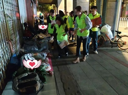 在服务活动开始之前,志愿者们汇集于地铁口,有条不紊地进行岗前培训,讲解一条条主意事项。服务过程中,志愿者们分工协作,有的志愿者向在人行道里瑟瑟发抖的露宿者送去面包和矿泉水供其充饥;有的悄悄地在露宿者的身边放上爱心物资,担心打扰他们休息;有的志愿者深入小巷给他们提供一些力所能及的帮助,哪怕是简单的嘘寒问暖,送上一瓶风油精等。此次志愿服务至次日凌晨2点才结束。服务结束后,志愿者们回到集合地点进行志愿服务心得交流。