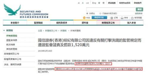 据香港证监会的通告显示,国信证券(香港)经纪有限公司因违反有关打击洗钱的监管规定而遭证监会谴责及罚款1520万元。