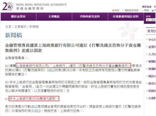 2018年8月,上海商业银行有限公司也曾因为违反《打击洗钱及恐怖分子资金筹集条例》被罚款500万港元。