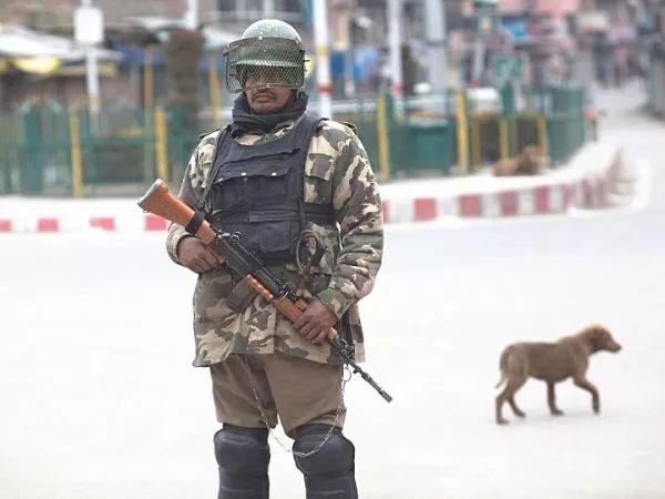 3月1日,在印控克什米尔斯利那加市,一名安全人员在街道上警戒。
