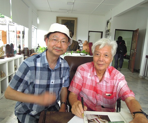 马来西亚拿督陆景隆及夫人在刘欣耕作品前合影