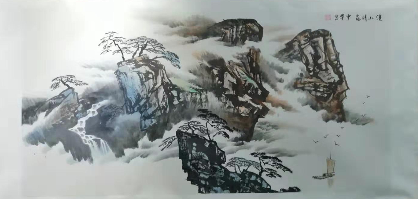 周中华同时是著名的哲理诗人,他在诗歌创作中,将想象力发挥到淋漓尽致,从寻常可见的生活细节中,展现深刻的哲理,常常说出人人胸中皆有、人人口中皆无的独到感悟。他将诗人的想象力运用到国画山水创作中,创作出一幅幅精彩的山水作品。他用笔自由奔放,韵味十足,用墨淋漓恣肆,富有感染力。构图雄奇多变,既能自由自在地造“险”,又能伸缩自如地平“险”,出神如化。画风俊朗,隽永秀逸,自成一格。
