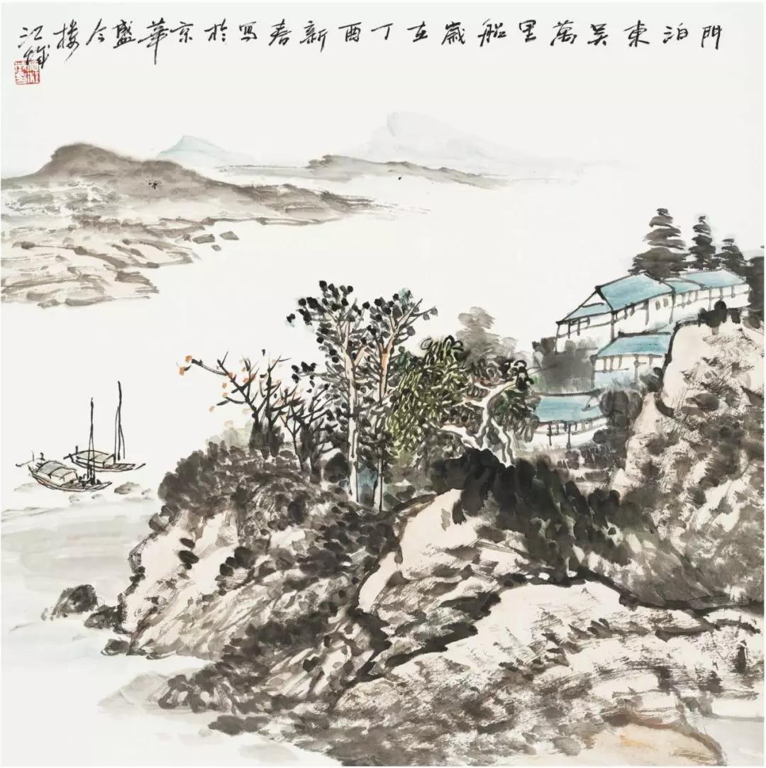 湖北省中国画学会会长施江城受邀参加了此次活动,并展出了自己的作品《门泊东吴万里船》,表达出对长江自然文化景观的独特神韵。他的画将现代的构成色彩肌理与传统的笔墨相结合,使浅淡的远山与浓墨的近景对比,形成了独特的山水画风貌。