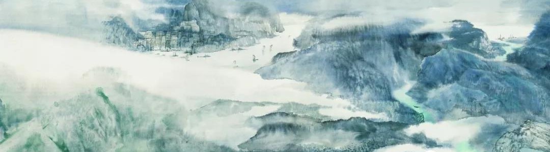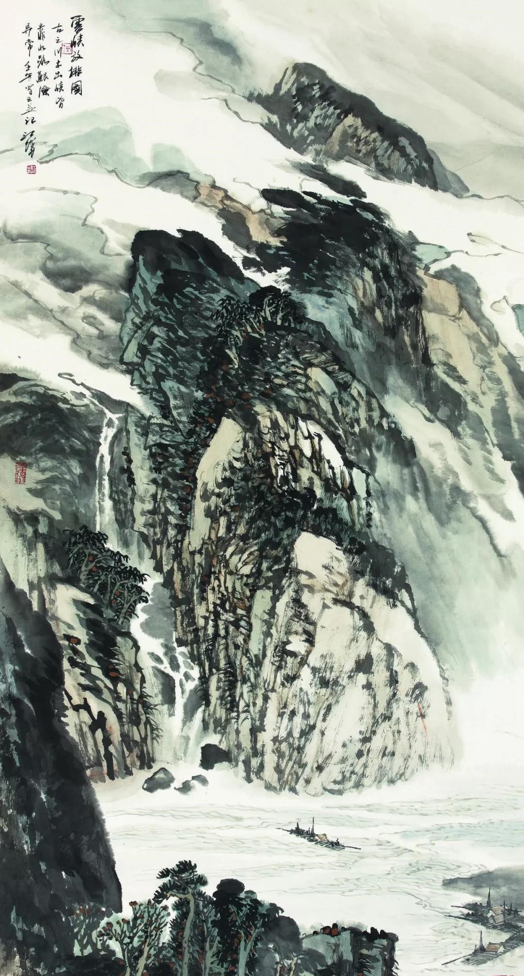 在他描绘的天地间,元气淋漓,草木郁郁葱葱,墨色缤纷,厚重华滋。从昆仑山的精微勾勒至长江出海口的细致摹写,笔笔遒劲,如游云惊龙飞舞在连绵起伏的峰峦之间。他对皴、擦、点、染传统技法非常娴熟。行笔自由肆意,用墨轻重有度,反复皴点,层层积染,浓厚华茂,色彩清新淡雅,独辟蹊径。他笔下的长江两岸,重峦叠嶂,大开大合,气势磅礴,浑厚、苍莽、虚幻、神秘,在笔墨中透析出他对长江的又无比深情。