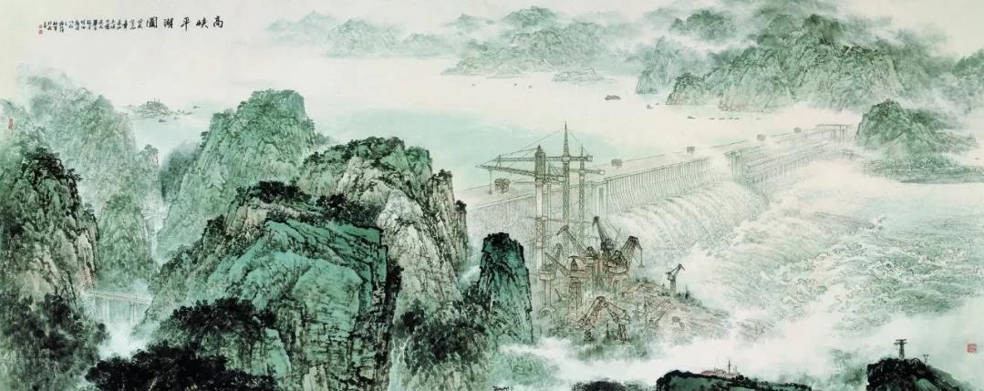 施江城的三峡山水画系列,不仅承载着深厚的传统文脉,也焕发着清新的时代精神。2009年在他主笔创作了巨幅《高峡平湖图》,成为国家重大历史题材创作工程的入选作品,后又为国家博物馆收藏并长期在“复兴之路”展览中陈列展出。这幅作品中自然与人文、精神与作品的高度统一,文化深意与笔墨韵味相应融合,充分展现出传统中国画笔墨表达语汇的现代性生命力;画面跌宕起伏,气象万千,山峦逶迤,白云万里,笔墨千变万化中时见雾掩青松,偶有霜染枫叶,无论林木历历还是溪泉涓涓,或是滚滚波涛,还是那塔吊起重机横扫江河作业,满眼生机盎然,处处笔墨华滋,才情四溢;构图中勾勒以中锋主笔,侧锋相辅去表达他自己的绘画语言,施江城在皴、擦、点、染等技法极致注重,墨色轻重有度,焦、浓、重、淡、清五色变化多端,黑白关系处理恰到好处,画面和谐统一,水墨氤氲。