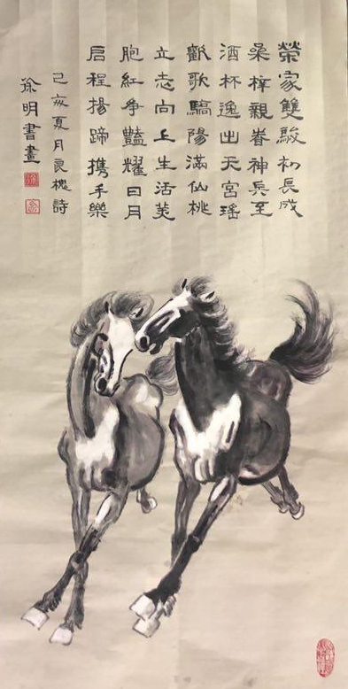 徐明生于福建,幼时随父母部队迁入武汉,由于父母非常注重文化素养和艺术修养,读书,写字,作画也便成了生活中必不可少的精神食粮。徐明从小耳闻目染,画画的天赋也初露头角。在一次参观中,偶然看到徐悲鸿大师的八骏图,被这幅画深深地吸引。从此之后,他就爱上了画马,十年如一日潜心画马,从未觉得枯燥。