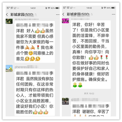 当记者电话采访世纪彩城业主林女士时,她情绪激动的说:“我在家隔离20多天,曾担心时间长了没吃没喝,现在有了李洋君这些志愿者,好邻居,我心里踏实了。我们这个小区虽然没有业委会,但我们有志愿者,我什么也不怕了。”