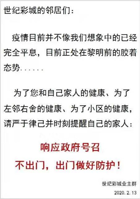 在万众一心抗疫情这个特殊的时期,由小区业主李洋君女士自发组织的志愿者小组,将省、市新冠肺炎防控指挥部发布的公告通过微信群,及时传递给每一户。为了小区1700多户居民的安全,减少流动,防止交叉感染,她们主动与菜农联系,将蔬菜送到小区为居民分发。居家隔离20多天,很多家庭天然气快用完了,她们通过微信群登记,为每一户居民去圈存,解决居民生活上的后顾之忧。