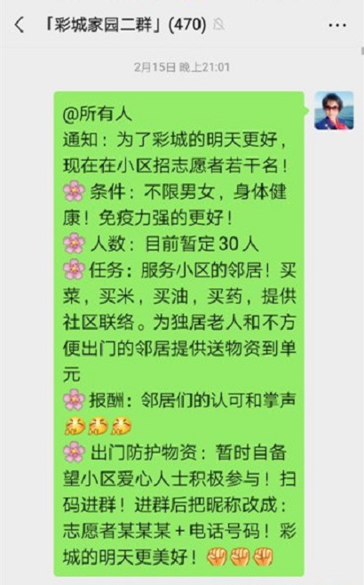 英雄帖:现为小区招聘志愿者若干,任务:服务小区邻居,送菜、送米、送油、送药。报酬:邻居们的认可和掌声。