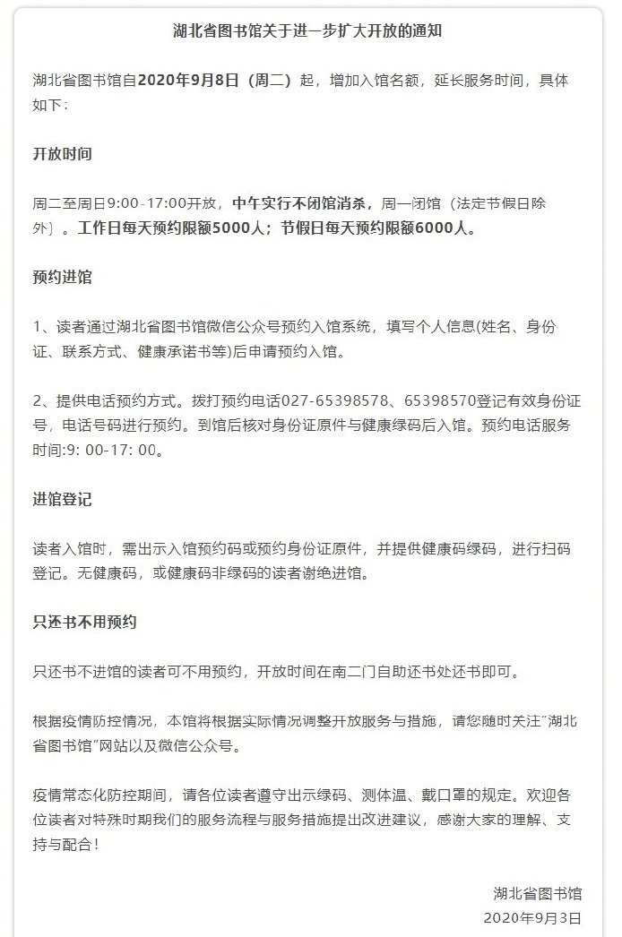 2020年9月3日湖北省图书馆发布《湖北省图书馆关于进一步扩大开放的通知》。湖北省图书馆自2020年9月8日(周二)起,增加入馆名额,延长服务时间,具体内容为:①周二至周日9:00-17:00开放,中午实行不闭馆消杀,周一闭馆(法定节假日除外)。工作日每天预约限额5000人;节假日每天预约限额6000人。②读者可通过湖北省图书馆微信公众号预约入馆系统或拨打预约电话,申请预约入馆。③读者入馆时,需出示入馆预约码或预约身份证原件,并提供健康码绿码,进行扫码登记。无健康码,或健康码非绿码的读者谢绝进馆。④只还书不进馆的读者可不用预约,开放时间在南二门自助还书处还书即可。