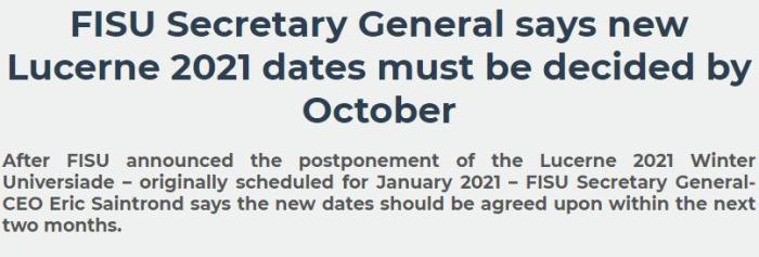 近日,国际大学生体育联合会通过官网宣布:受全球新冠肺炎疫情影响,经国际大体联、赛事组委会和瑞士大学生体育联合会共同评估决定,原定于2021年1月21日至31日在瑞士卢塞恩举行的第三十届世界大学生冬季运动会将推迟举行。