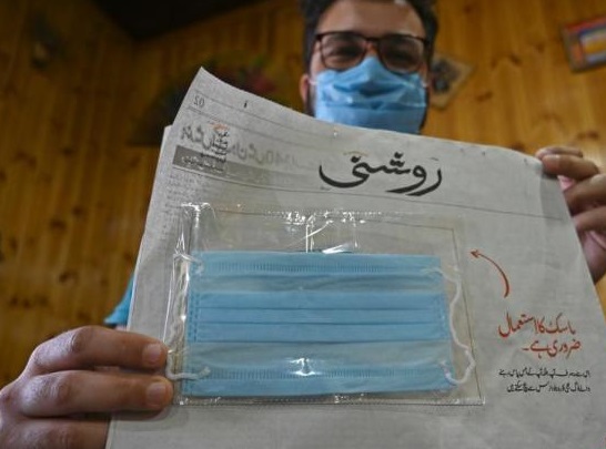 当地时间7月23日,印控克什米尔斯利那加,一份当地乌尔都语报纸“Roshni”为了提高人们对新冠肺炎的认识,向读者免费提供了口罩,并将其贴在头版。