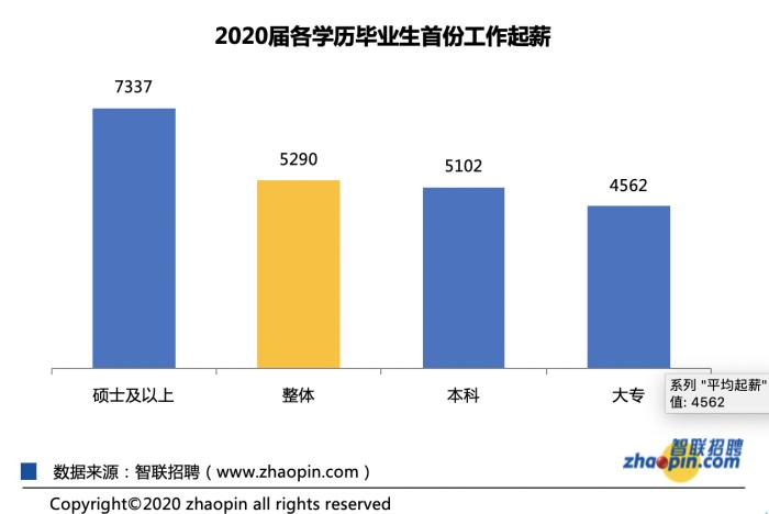 根据智联招聘平台大数据,2020届毕业生第一份工作的平均起薪为5290元/月,且薪资与学历高低成正比。