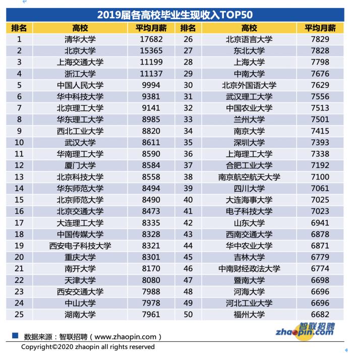 智联招聘对2019届毕业生的毕业院校及平均月薪进行追踪发现,毕业生收入高低与其毕业院校的等级形成强关联,毕业生收入排行前50名的高校多为双一流/211/985类大学。