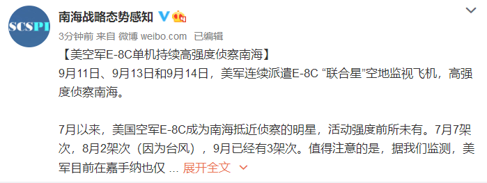 据“南海战略态势感知”计划平台14日发布的消息,9月11日、9月13日和9月14日,美军连续派遣E-8C “联合星”空地监视飞机,高强度侦察南海。消息称,自7月以来,美国空军E-8C成为南海抵近侦察的“明星”,活动强度前所未有:7月7架次,8月2架次(因为台风),9月已经有3架次。