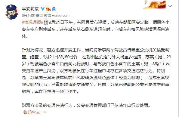 经查,9月21日8时50分许,在朝阳区安定门外大街至安定路,苏某(男,29岁)驾驶黑色小客车由南向北行驶时,与驾驶白色小客车的王某(男,35岁)因变更车道产生纠纷,双方驾驶员在行车过程中均存在多项交通违法行为。特别是,苏某向王某驾驶车辆前挡风玻璃泼洒深色液体(经查为咖啡),造成王某视线受阻的行为,严重影响道路交通安全。目前,苏某已被朝阳公安分局依法刑事拘留,案件正在进一步工作中。