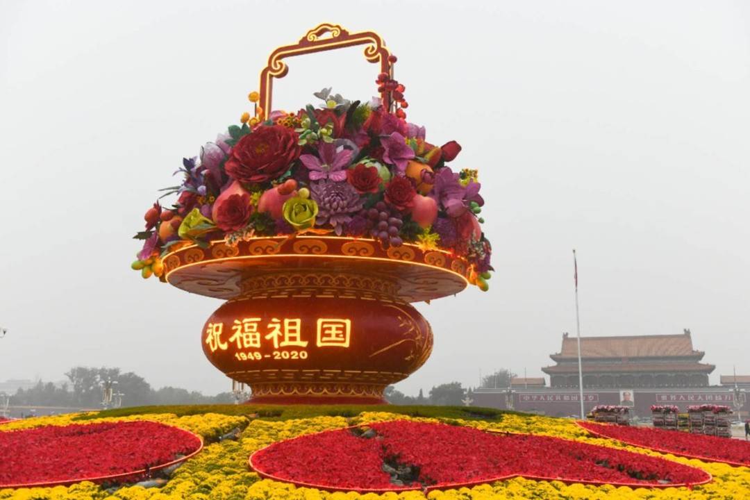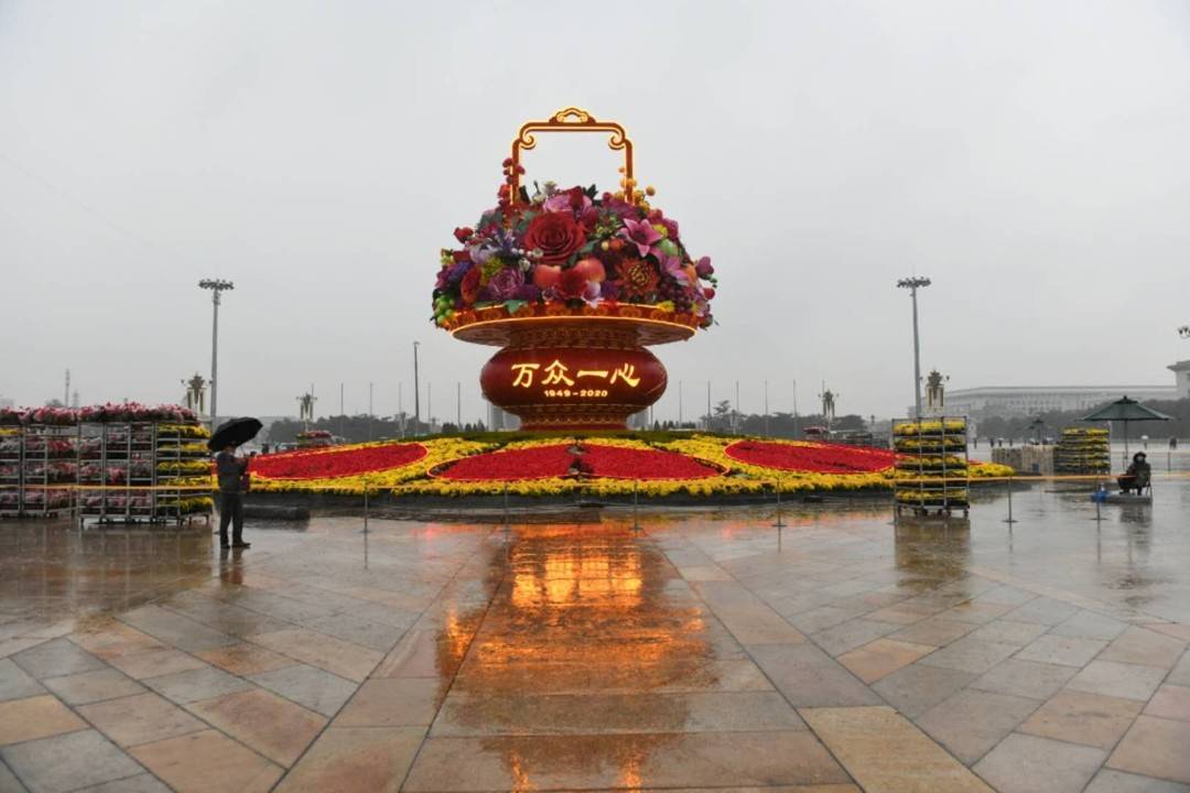 23日上午,经过一整夜的施工,天安门广场“祝福祖国”花篮主题花坛吊装完成,在雨中初现芳容。游客冒雨与花坛合影,为祖国献上祝福。