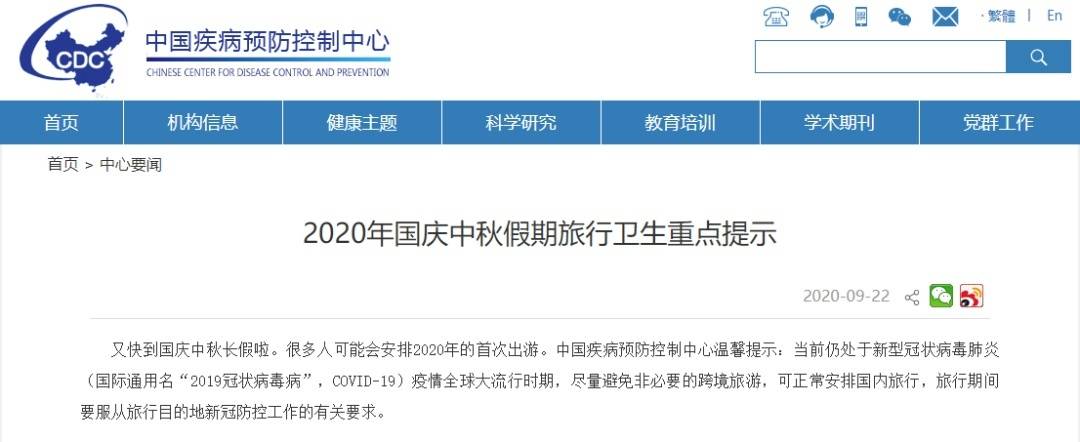 9月22日,中国疾控中心发布了2020年国庆中秋假期旅行卫生重点提示,其中明确指出,当前仍处于新型冠状病毒肺炎(COVID-19)疫情全球大流行时期,尽量避免非必要的跨境旅游,可正常安排国内旅行,旅行期间要服从旅行目的地新冠防控工作的有关要求。