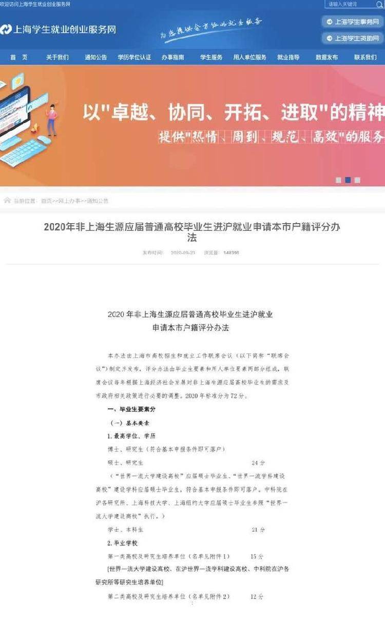 今天,《2020年非上海生源应届普通高校毕业生进沪就业申请本市户籍评分办法》正式发布。