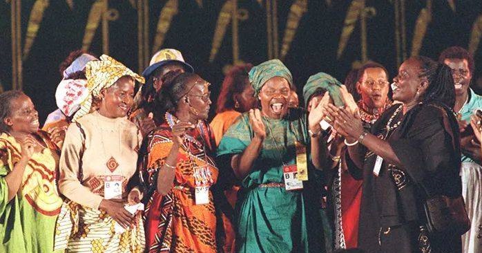 资料图:1995年,在北京出席世界妇女大会的各国与会者,参加欢庆晚会纷纷登台载歌载舞。