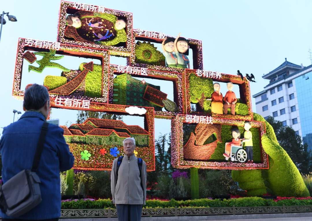 长安街沿线国庆主题花坛——位于东单路口西南角的《安居乐业》花坛。