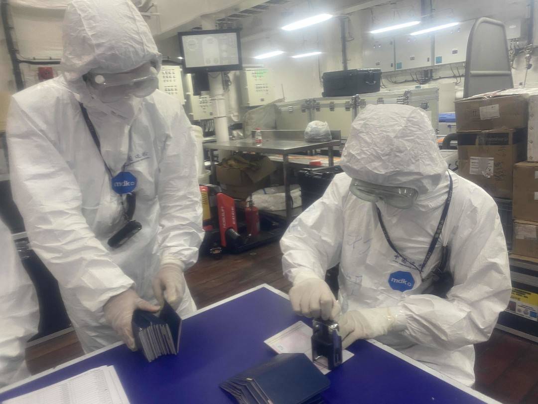 9月27日上午10时许,外高桥边检站抽调业务精湛的青年民警组成“青年民警突击队”提前赶赴极地码头。12时许,“雪龙2”号准时靠泊,民警身着全套防护装备登轮快速为科考船队员办理了入境手续,全力确保科考队员、船员们“回家”。