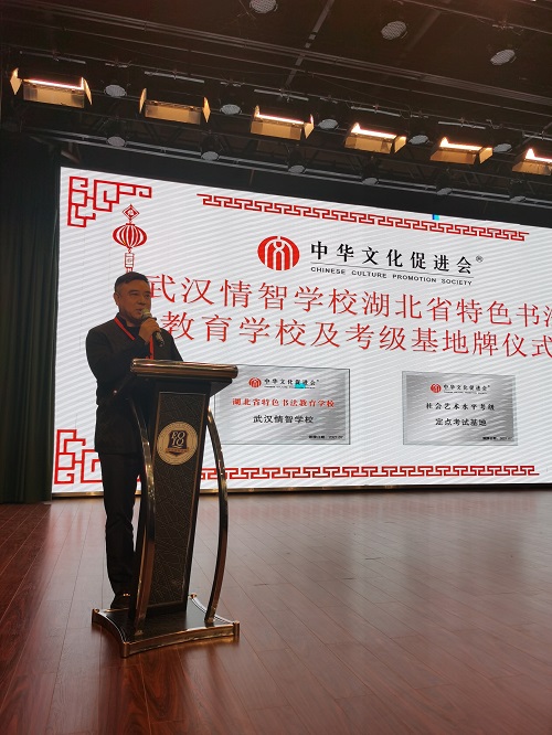 武汉情智学校徐海晏校长首先向出席授牌仪式的嘉宾介绍了武汉情智学校的发展历程、人才培养等方面的情况,并特别针对学校在艺术考级、高考美术生培训班进行的教学研发、美育发展的实践成果进行了介绍。同时,围绕社会艺术水平考级工作开展情况和未来重点工作方向进行了详细介绍。他强调:我们将以此次授牌仪式及考级为契机,以立足于学生书写能力的提高、立足于凸显书法教学特色为出发点,发展和壮大我们的书法艺术爱好者和教育者的队伍,真正让书法教育成为情智学校的素质特色,成为熠熠生辉的特色名片。