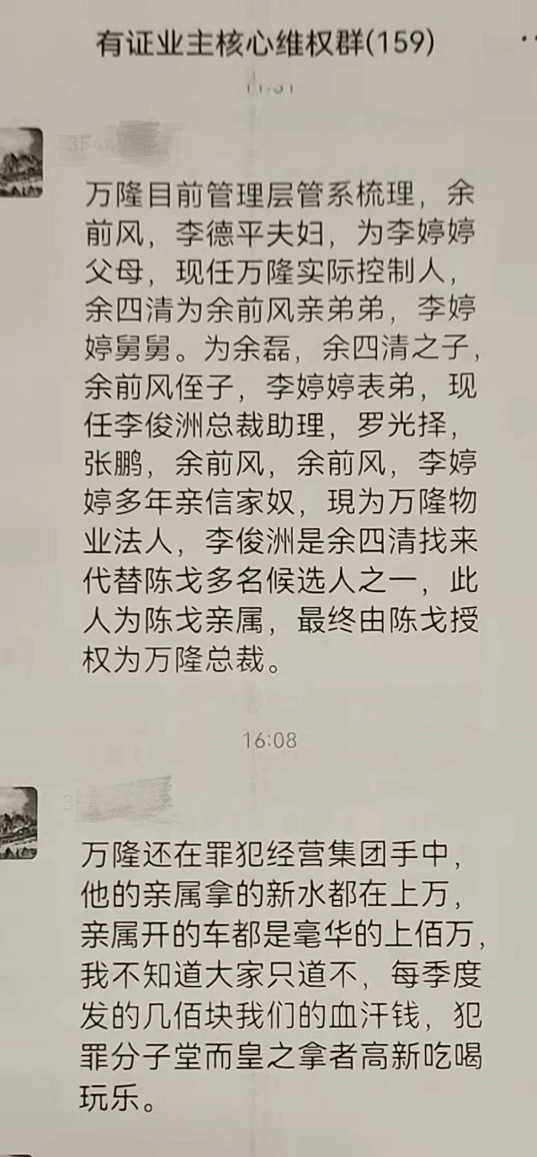 《万隆业主的真实遭遇》中这样写道,2021年5月,余某风、李某平夫妇以他人名义,在仙桃毛嘴镇购置两套别墅,用来藏匿犯罪嫌疑人李某婷诈骗所得脏物,其中包括市值2000万以上的爱马仕手提包,超千万元的金丝楠木家具及大量的珠宝、首饰、象牙制品等。余某风仍入住李某婷购买的御湖世家340平豪宅,出入乘座陈某戈名下价值高达近200万元的迈巴赫豪车。李某洲明知余某风等人的种种行为欺满政府和广大受害业主,依然沆瀣一气。
