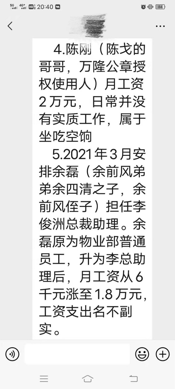 2021年3月,余某清完成人事档案的伪造工作后,调任工程部副经理,工资涨至10000元,日常并未有实质性工作;余某磊(余某风侄子、余某清之子)担任李俊洲总裁助理。余某磊原为物业部普通员工,任总裁助理后,月工资从6千元涨至1.8万元;陈某刚(陈某戈的哥哥,万隆广场公章授权使用人)月工资2万元,日常并没有实质工作,坐吃空饷;万某涛(余某风社会关系跑腿人员),任万隆广场招商部经理,但一直未在万隆广场入职工作,月工资2万元;君福物业公司法人代表张某鹏,月工资16000余元,日常并未在万隆物业公司工作;余某风将家庭保姆黄某芳安排在万隆广场保洁部,月工资4000并缴纳社保;刘某伟(余某风司机)为商场巡查员,闲暇时会到收费岗亭帮助收费,月工资实发6244元。