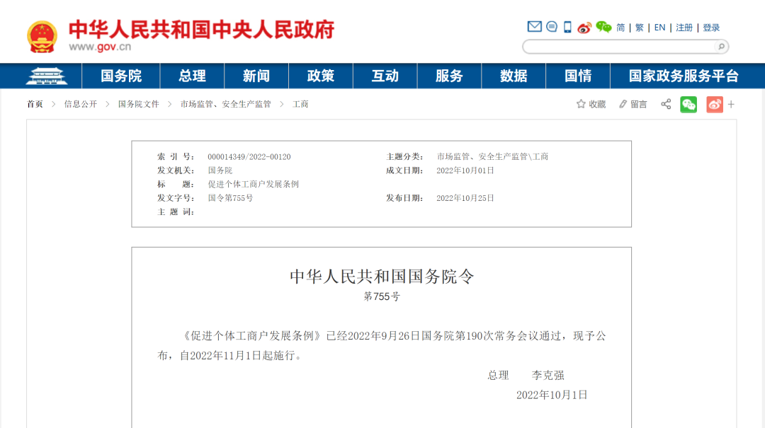 0月25日,据中国政府网消息,李克强签署国务院令,公布《促进个体工商户发展条例》。