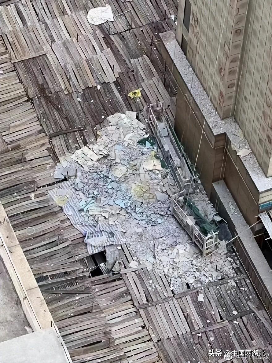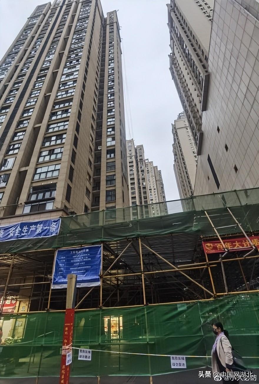 10月25日下午,武汉市武昌区凯德1818中心小区沿蓝调步行街正在进行外墙维修施工的楼面工地上,一块大型外墙砖从高空坠落,砸穿地面上方的防护钢板、竹跳板,砸中防护棚下排队做核酸的三人,其中一人当即倒地头部出血。