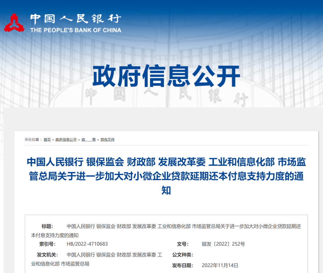 为进一步加大对小微企业等市场主体支持力度,深入落实好稳经济一揽子政策和接续政策,助力稳住经济大盘,近日,人民银行、银保监会、财政部、发展改革委、工业和信息化部、市场监管总局等六部门联合印发《关于进一步加大对小微企业贷款延期还本付息支持力度的通知》(以下简称《通知》),对于2022年第四季度到期的小微企业贷款,鼓励银行业金融机构按市场化原则与企业共同协商延期还本付息。
