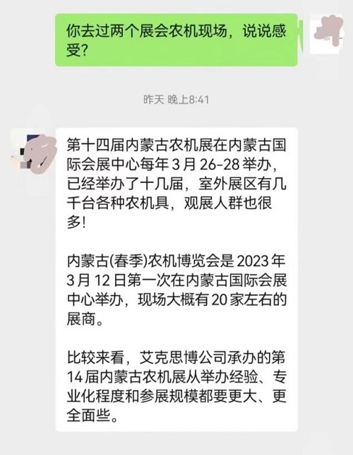 近日,网友曝料,艾克思博国际会展(内蒙古)集团有限公司计划 2 0 2 4 年 3 月 2 6 - 2 8 日,在内蒙古国际会展中心举办第 15 届内蒙古国际农牧业机械展览会暨农机团购节,因展馆方人为因素而搁浅。
