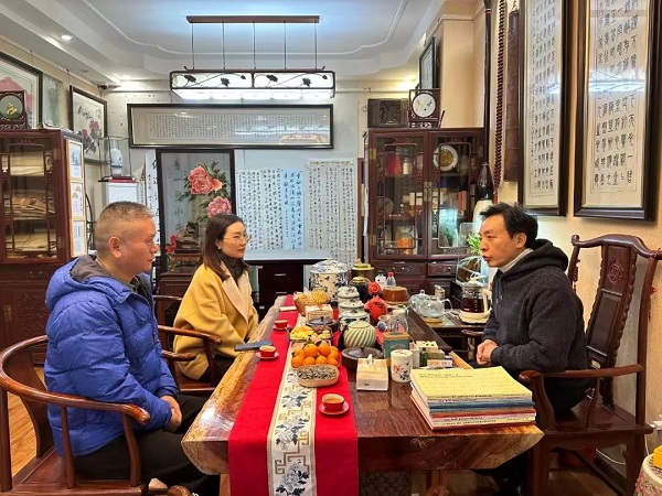 湖北省书协副主席、培训中心主任程新(左一),省书协办公室主任刘璐璐(中)在郁之书法工作室与王军先生交流