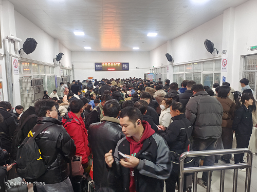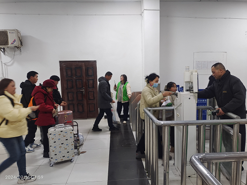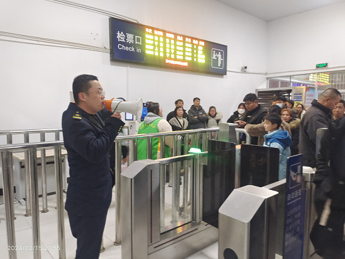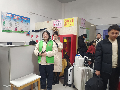 2024年2月15日晚上21时,记者在彭泽县火车站看见一位身着“南铁青年志愿者”字样的女生,一会儿在做安检,一会儿又在进出口验票,一会儿给旅客讲解今日车次,一会儿又帮特殊旅客拿行李,忙的不亦乐乎。